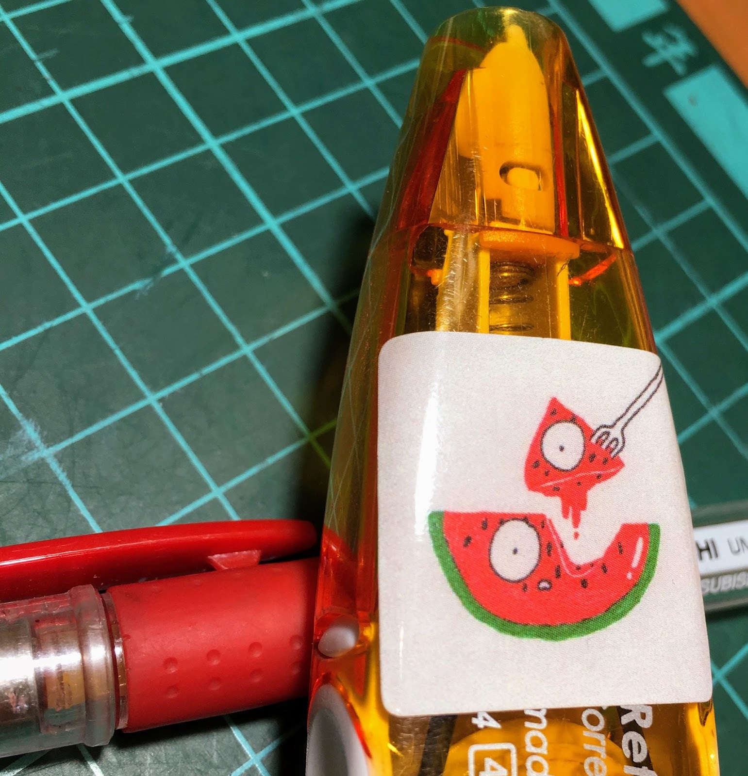 這是哥哥畫的血腥西瓜,貼在他的立可帶上: